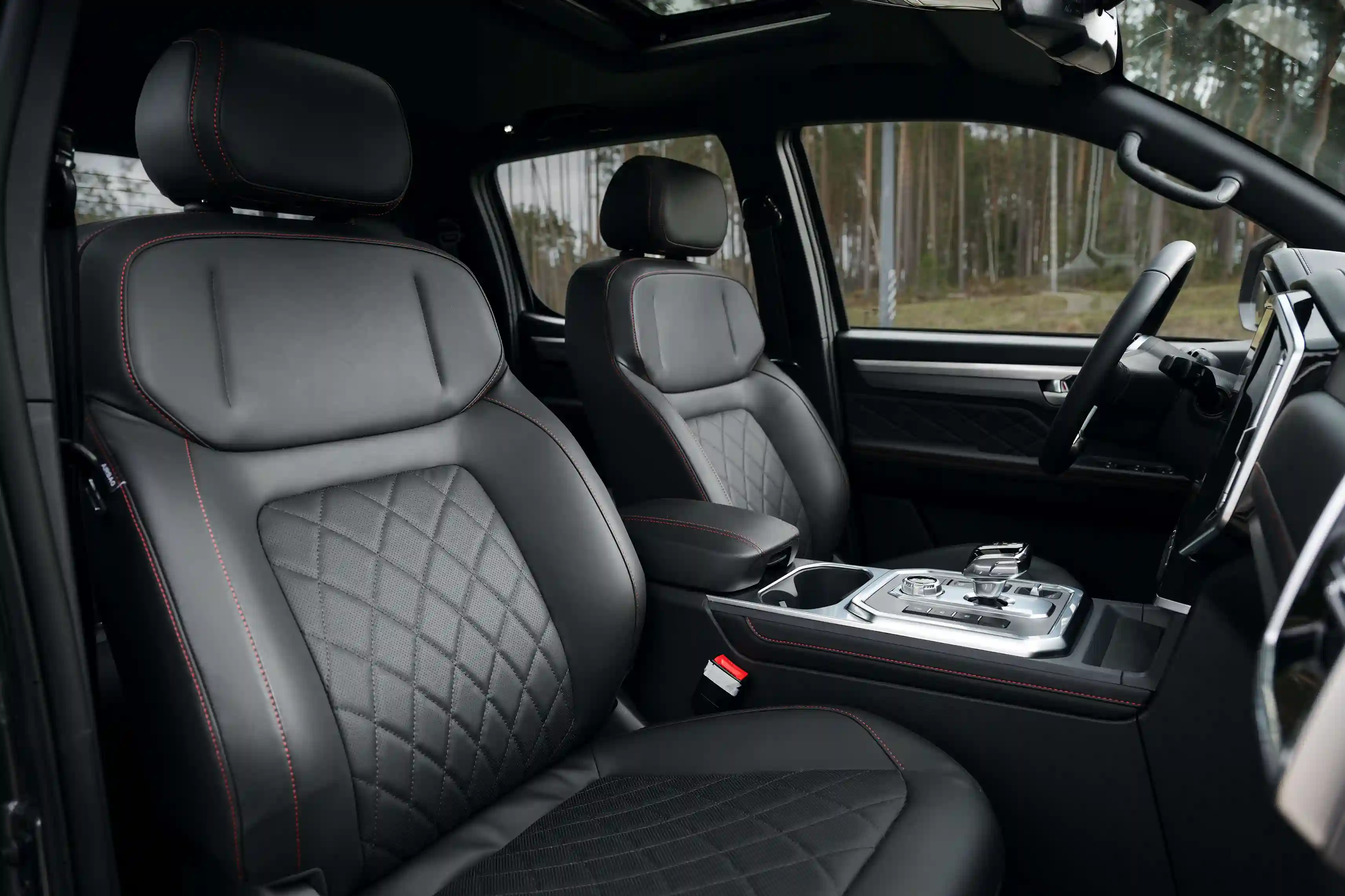 - Обивка салона из экокожи черного цвета с красной прострочкой